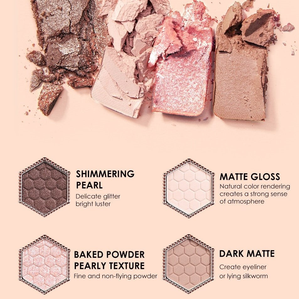HIGHLY PIGMENTED EYESHADOW: An eyeshadow palette with a high pigment content that comes in a variety of finishes, including shimmer, matte, satin, and metallic.