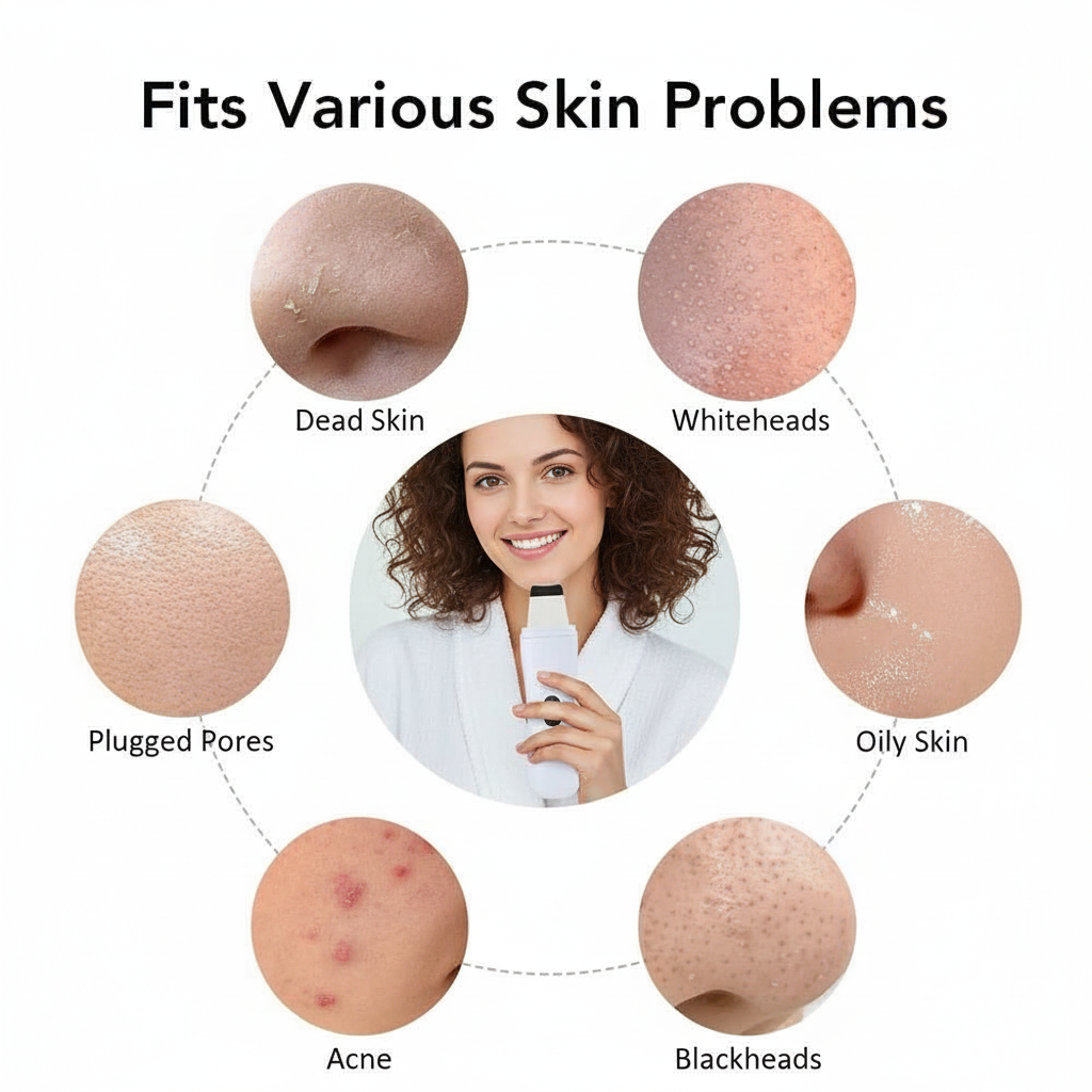 Reveal brighter, smoother, cleaner skin with this Ultrasonic Skin Scrubber — a 4-in-1 deep-cleansing facial device designed to unclog pores, remove blackheads, lift skin, and boost product absorption. Using high-frequency ultrasonic vibrations, it gently exfoliates dead skin cells while drawing out oil, dirt, and impurities from deep within the pores.