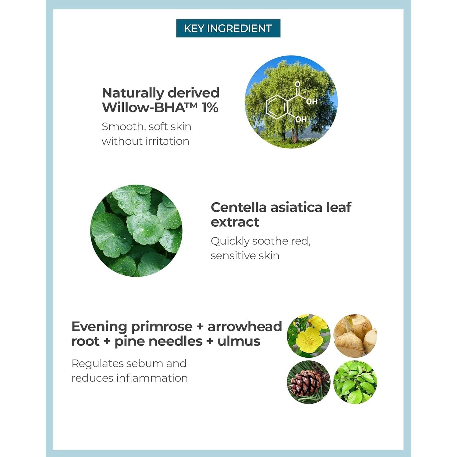 - Willow Bark BHA: Exfoliates to clear pore-clogging buildup and balance oil, giving you a fresher, more even-toned complexion.