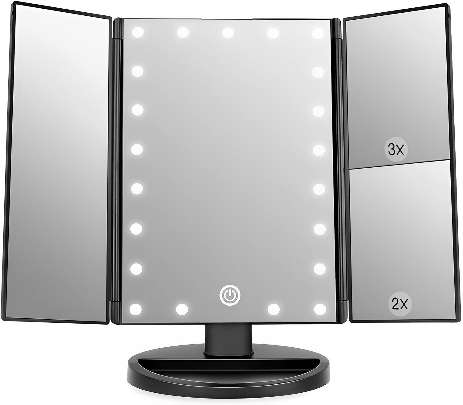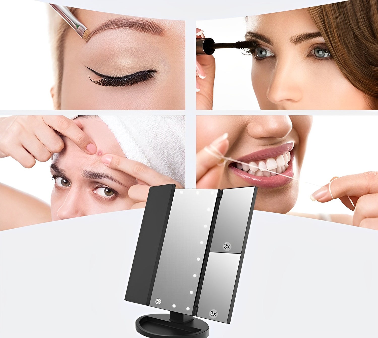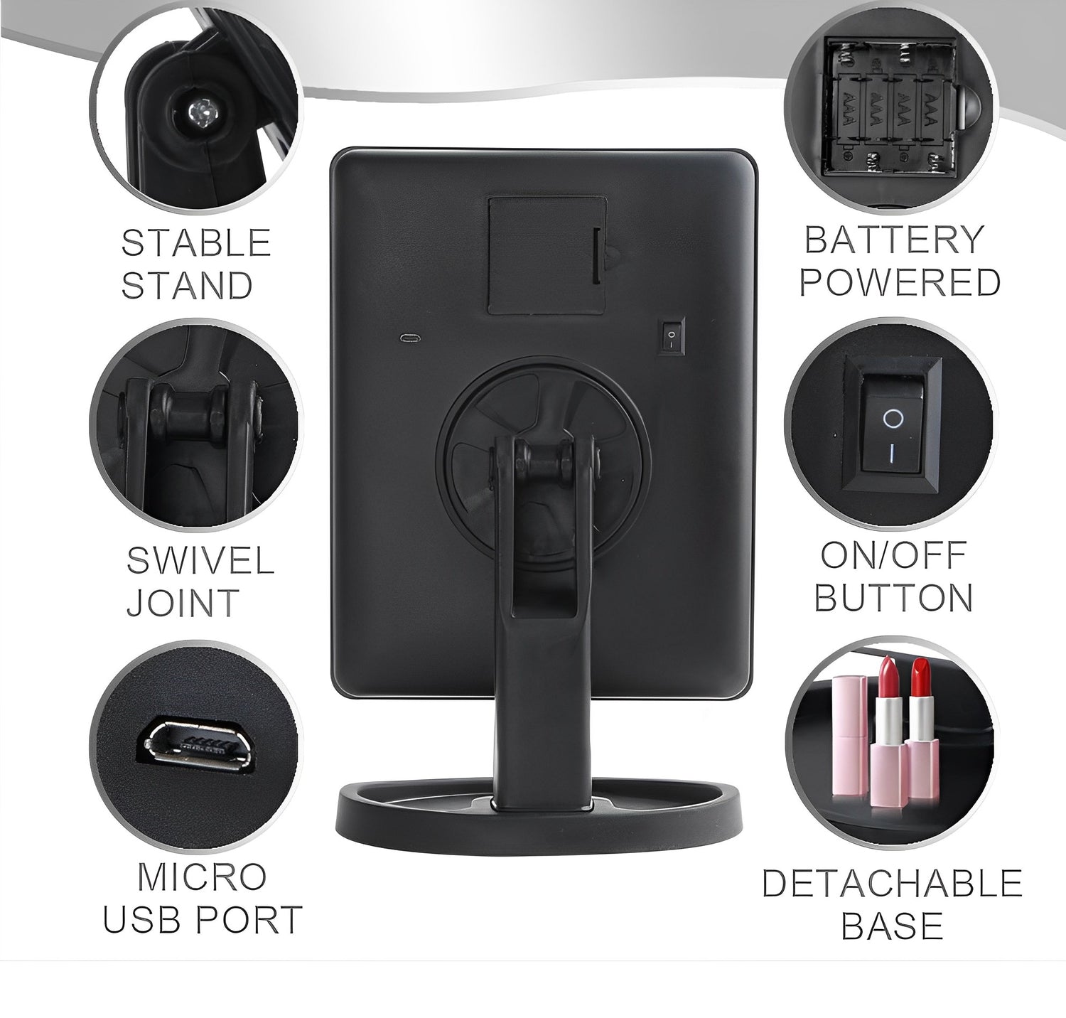 The 22 LED Light Makeup Mirror features a touch screen design with adjustable brightness and 2X/3X magnification plates, allowing for precise makeup application. Its 180-degree rotating, tri-fold design makes it portable and easy to use, while its high-quality materials make it durable and resistant to scratches and stains.