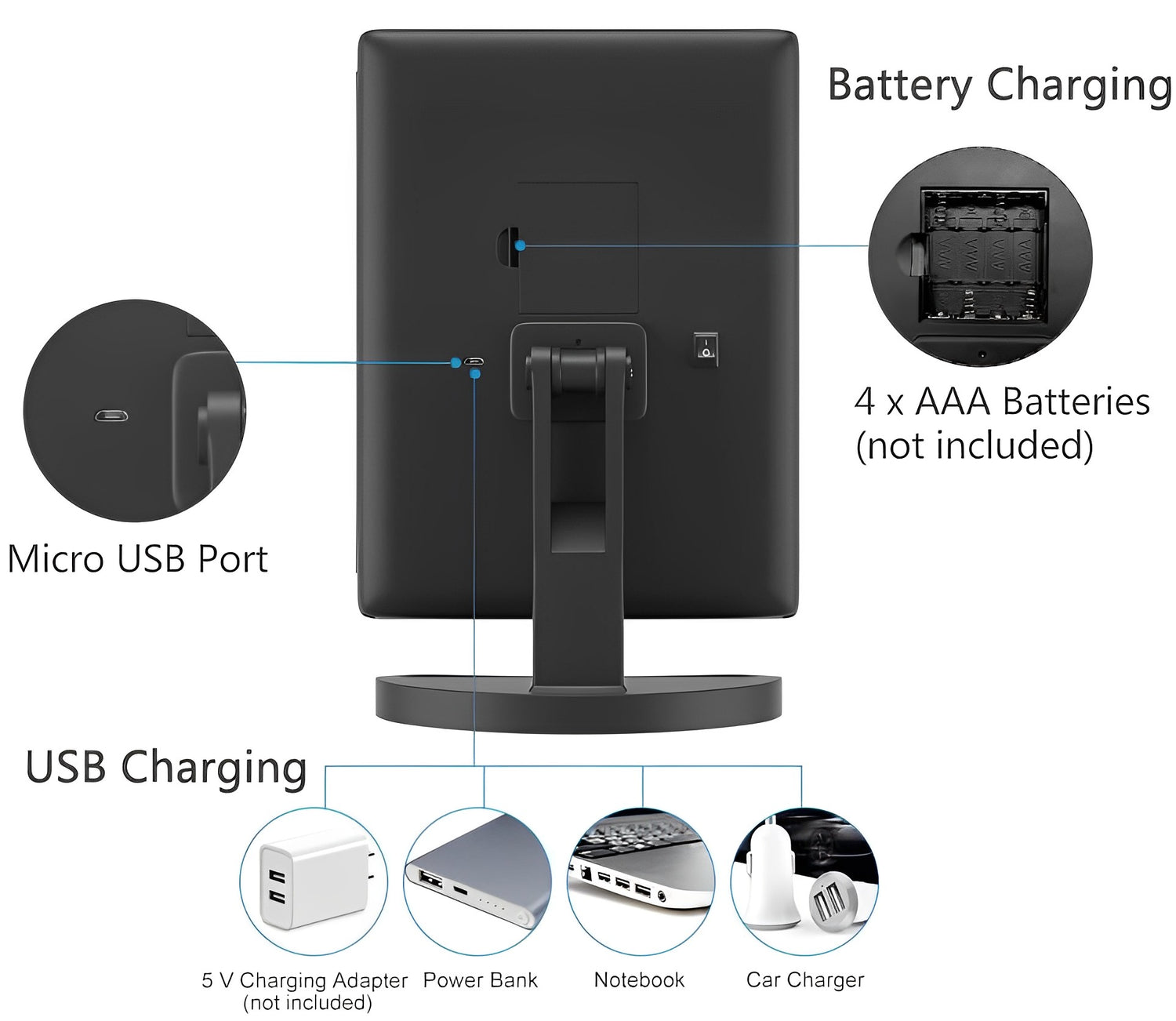 The mirror can be powered by either 4 AAA batteries or a USB cable (included in the package).