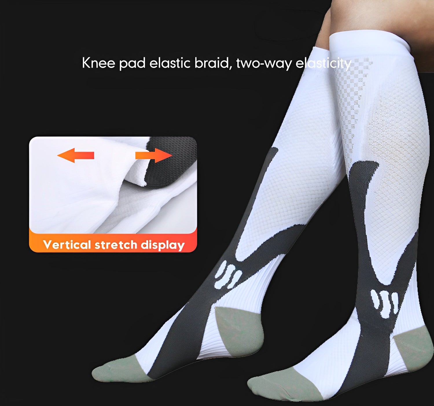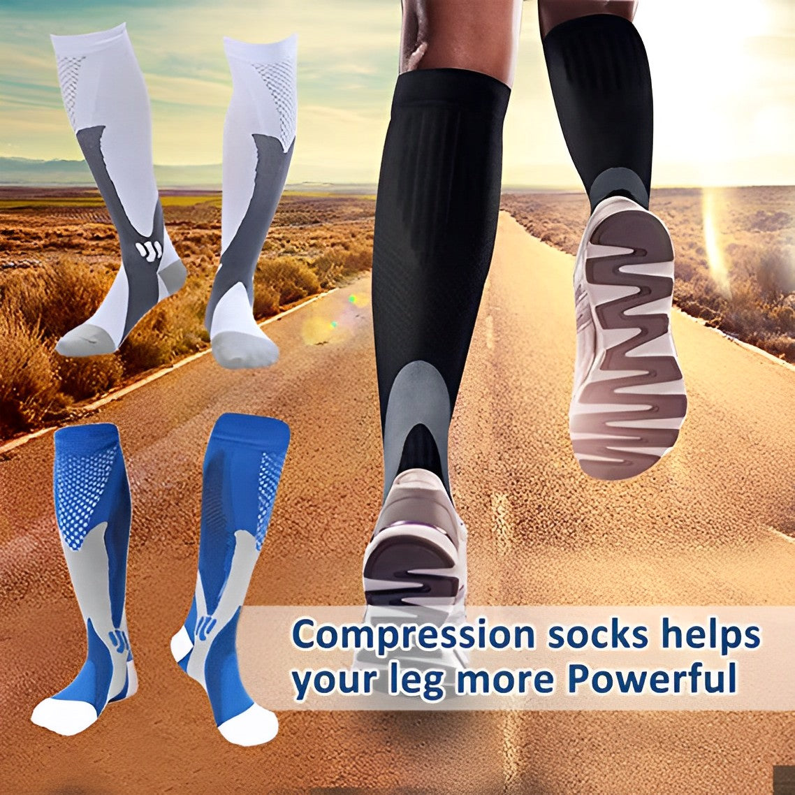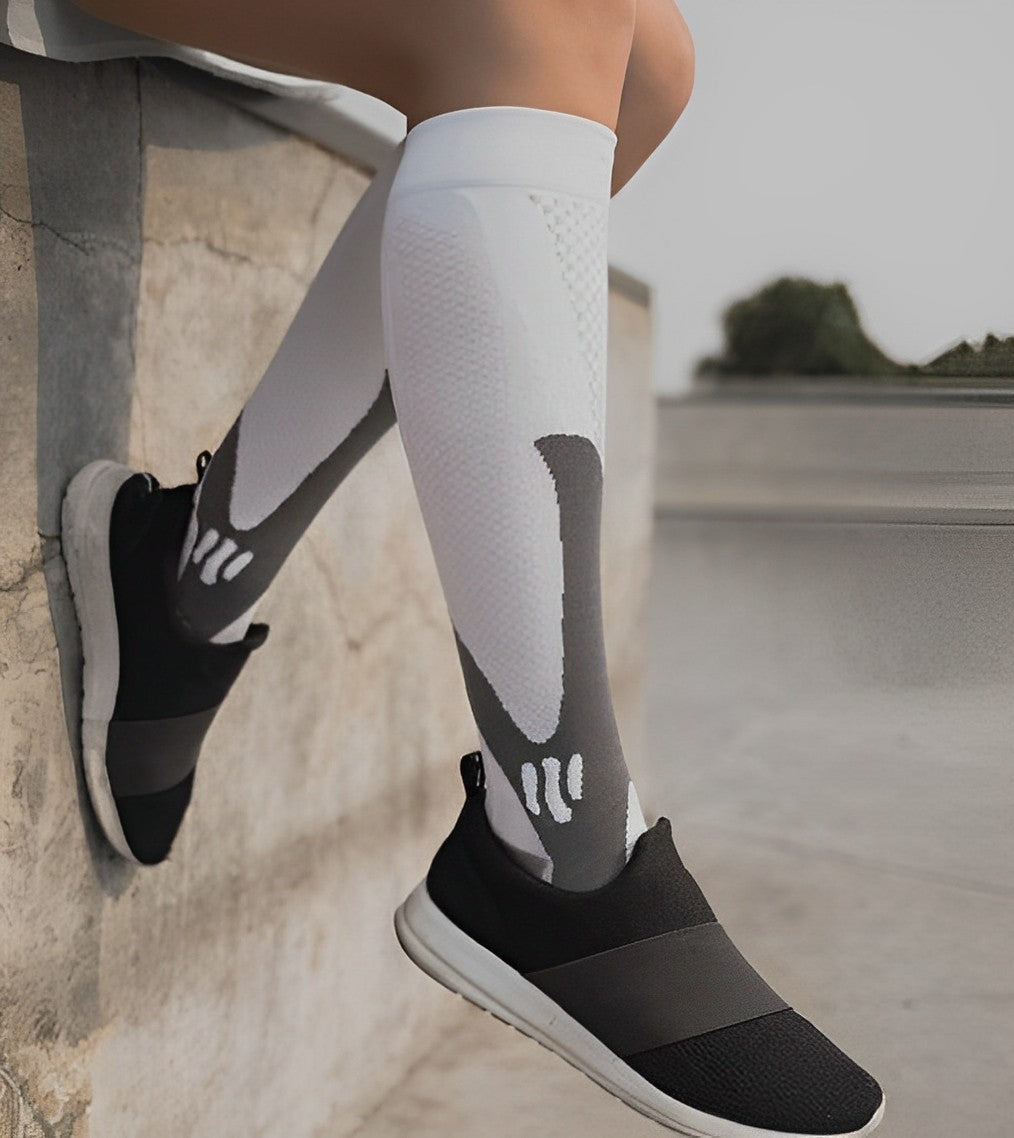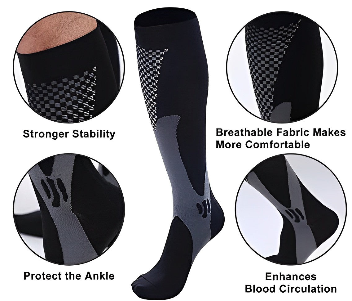 Compression socks work by providing graduated pressure from ankle to calf, which helps improve blood circulation and reduce leg pain and swelling. The compression fabric also supports joint stability and muscle recovery during and after physical activity.
