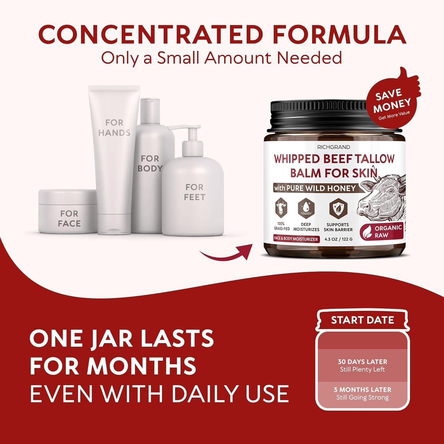 Get the glowing, velvety skin you've always wanted with RICHGRAND Whipped Beef Tallow Balm. This 122g jar is packed with powerful, natural ingredients that mirror your skin's own lipids, providing instant absorption and long-lasting hydration. Rich in vitamins A, D, E, and K, this balm will leave your skin feeling smooth, soft, and radiant.