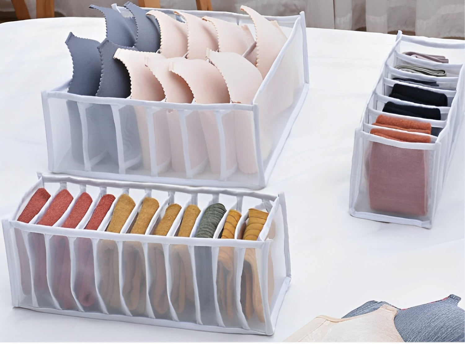 The Underwear Organizer with Divider Boxes allows you to easily sort and store your underwear, bras, socks, and other items in an organized and tidy manner. The compartments make it easy to find what you need, and the foldable design allows for easy storage when not in use.
